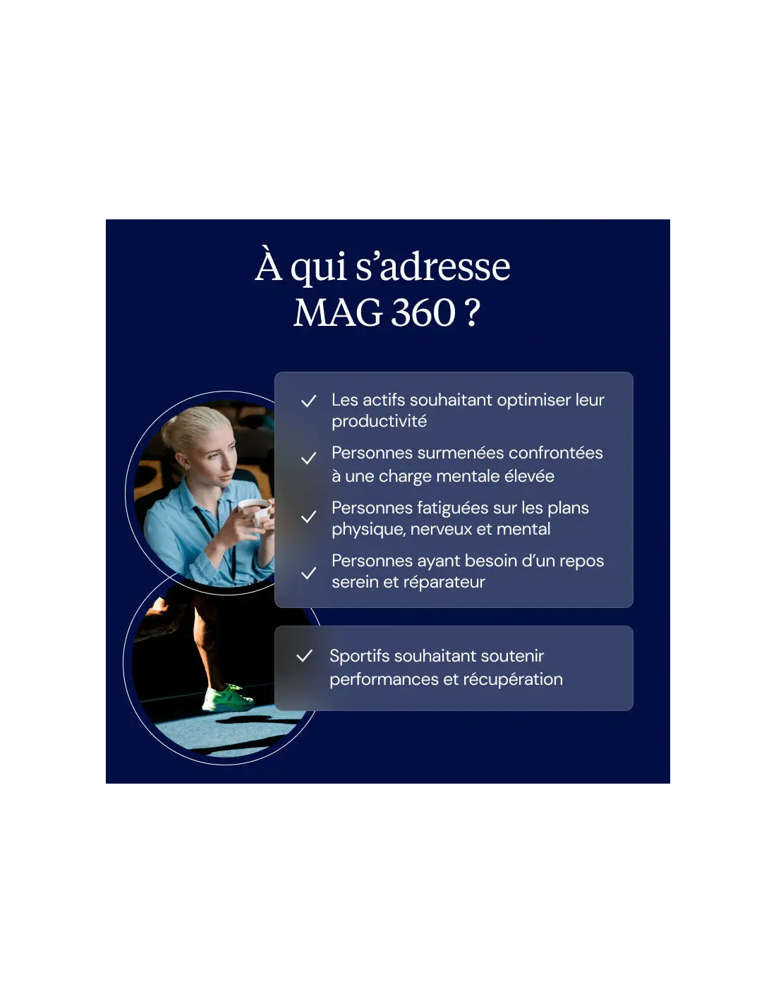 Conçu pour les personnes qui se sentent à plat (baisse d’énergie, épuisement lié au rythme, sensation de “batterie vide”), notamment en période de surmenage ou de journées intenses. Convient aussi à celles qui souhaitent retrouver un niveau d’énergie plus stable au quotidien, que ce soit au niveau physique ou mental.