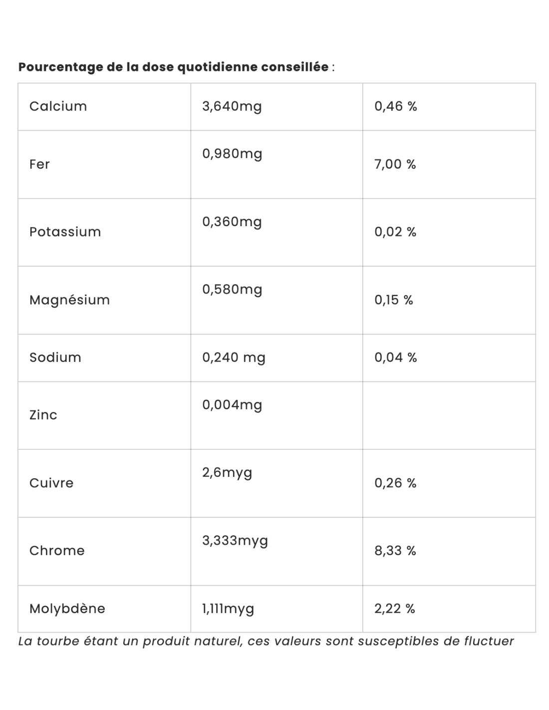 1 dose journalière recommandée de tourbe liquide (20 ml) contient :
